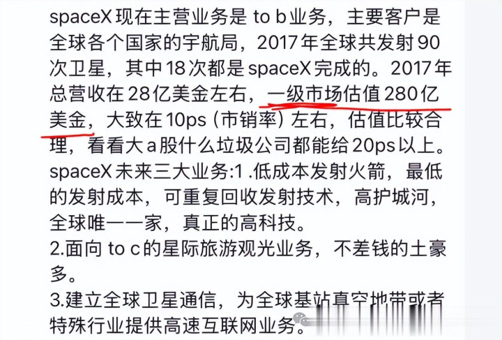 2018年左右,我研究过SpaceX的一级市场股权基金,当时市场给SpaceX的估值是280亿美元,等于7年左右估值暴涨50倍左右。